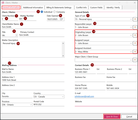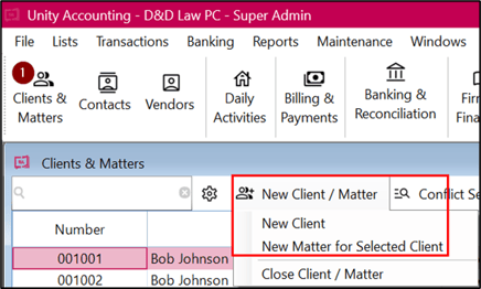 - To add a new matter for the same client, select the client from the list in clients and Matters, click on New Client/Matter in Clients and Matters and select New Matter for Selected Clients and follow the same instructions above with the exception that the Client Number cannot be changed here.