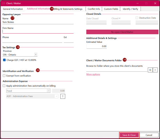 - Enter the name of the opposing lawyer and the opposing party name if any.