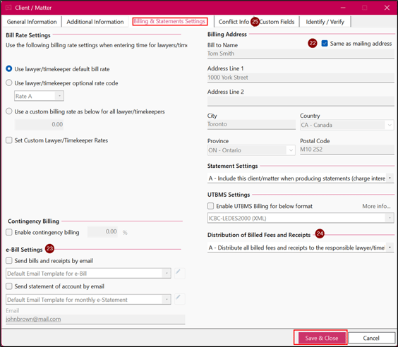 - Click on the next tab Billings and Statements where bill rates can be defined for a client. New rates can also be set per lawyer.