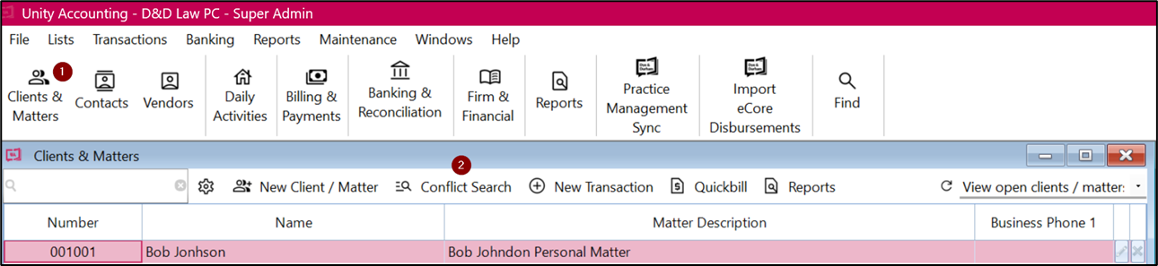 - Unity® Accounting will do an automatic conflict search every time a new matterid or client is added.
