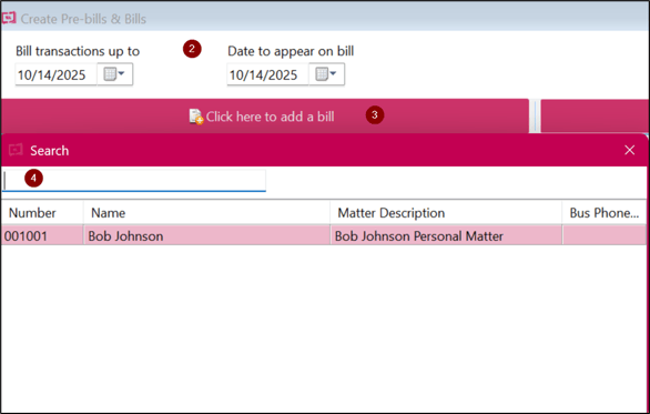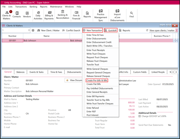 - Click on Clients & Matters and select New Transaction > Create Pre-bills and Bills.