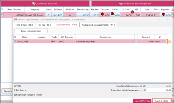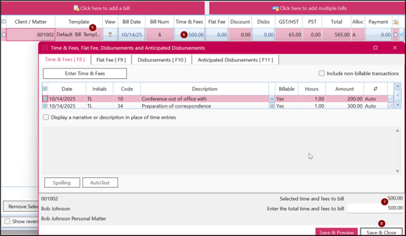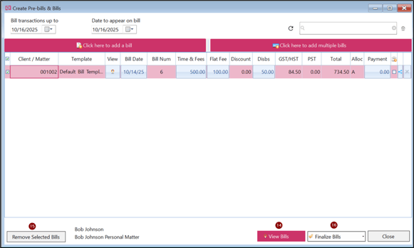 - In case bills are not finalized, bills will remain in the Create Pre-bills and Bills window until the same is removed and the status of time and fees and disbursements related to a bill will show as Pre-billed.