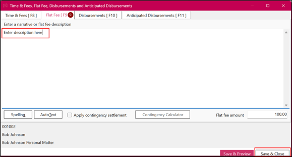 - For flat fees, click on Flat Fee and enter the description and the amount, then Save & Close.