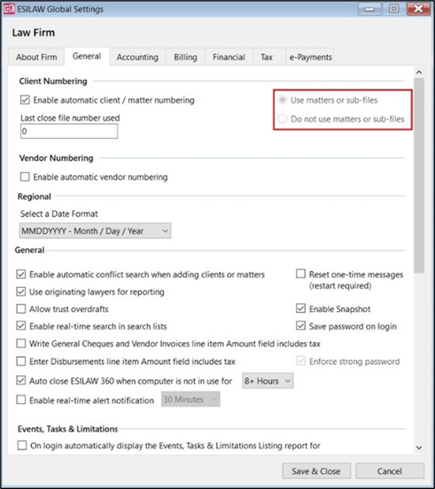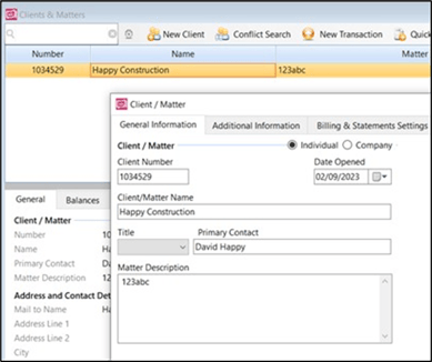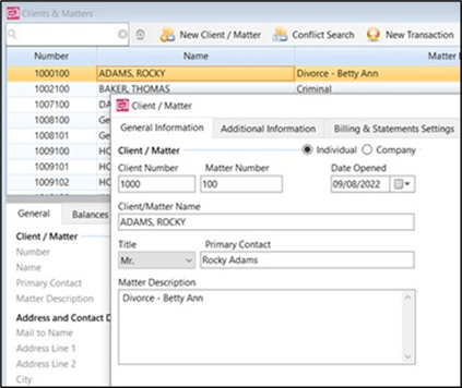 Using Matters or Sub-files attaches two numbers to a file: a Client Number and a Matter Number. One Client Number can then be followed but subsequent increasing Matter Numbers. These two numbers are then concatenated on the Clients & Matters summary screen to create the “Client/Matter Number”. Whenever a new matter file added, the client's information is automatically populated to new matter file.