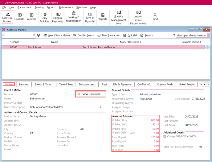In this tab users can get a quick access to client/matter description, contact details, general information such as who the responsible lawyer is, account balances and the latest activity on the file. All Account Balances are clickable and will take the user to the appropriate ledger. The user can also open a linked document folder by clicking on View Documents.