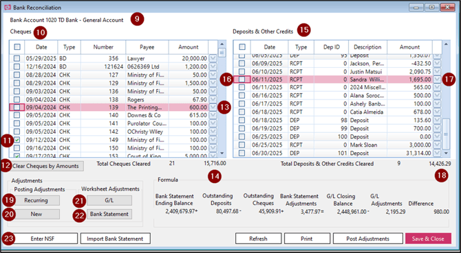 - Journal entries that have been posted to the general ledger will not display in the bank reconciliation window but will affect the balance. Take these into consideration when considering your total balances for cleared cheques etc.