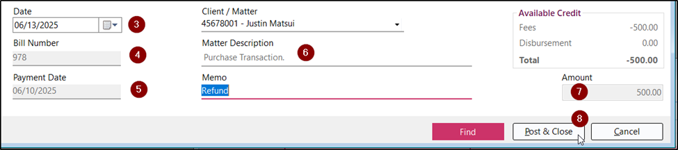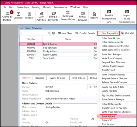 - Click on Clients & Matters > select New Transaction > Enter Refunds.