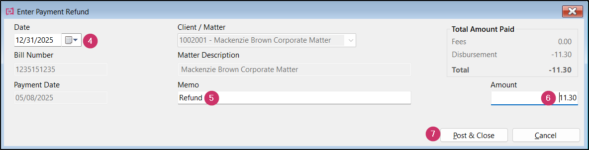 The Refund feature is used to refund overpayment that has been applied to a client or matter or bill payment.