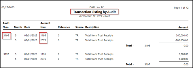 For example, if a Trust Receipt is entered in GL1195, then run the Transaction Listing by Audit report only selecting GL1195, the report will indicate that the audit is out of balance as not all the General Ledger accounts were selected.