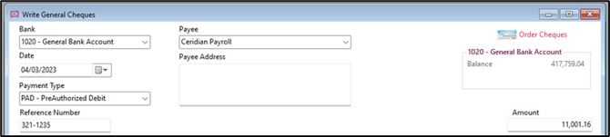 The firm is now ready to enter payroll details to Unity Accounting, whether a single value provided by a Payroll Provider, or individual cheques to each employee and to the Receiver General. This will assist in accurately recording the firm's expenses, as well as support in the general bank reconciliation.