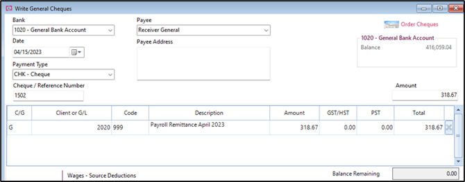 - Specifically with respect to the Vendor: Receiver General, the firm will use the general ledger related to the Source Deductions payable G/L when invoices are created. This will offset the source deductions that were posted when the general cheques were created to each employee for their payroll.