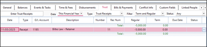 The resulting list will show the total accumulated trust receipts for the matter since the beginning of the financial year, helping you determine whether TAF should be applied.